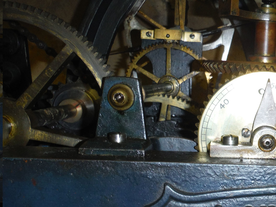 The engineer at Smith’s did suggest a 90:9 ratio, but I find it hard to imagine this clock only had a one second pendulum. That’s only about a metre, the same as a typical long case (“grandfather”) clock. The pendulum at St. Alkmund’s is 1.5 seconds or about 2.24m. The Trinity clock pendulum is described as being “2 metres” but it’s not clear how they are measuring it. The length of a pendulum is measured from the pivot to the centre of mass and so the overall physical length of the pendulum may be quite a bit longer. 2m is not a standard/ common length so I suspect it’s an approximation of the physical length rather than an accurate “functional length”.